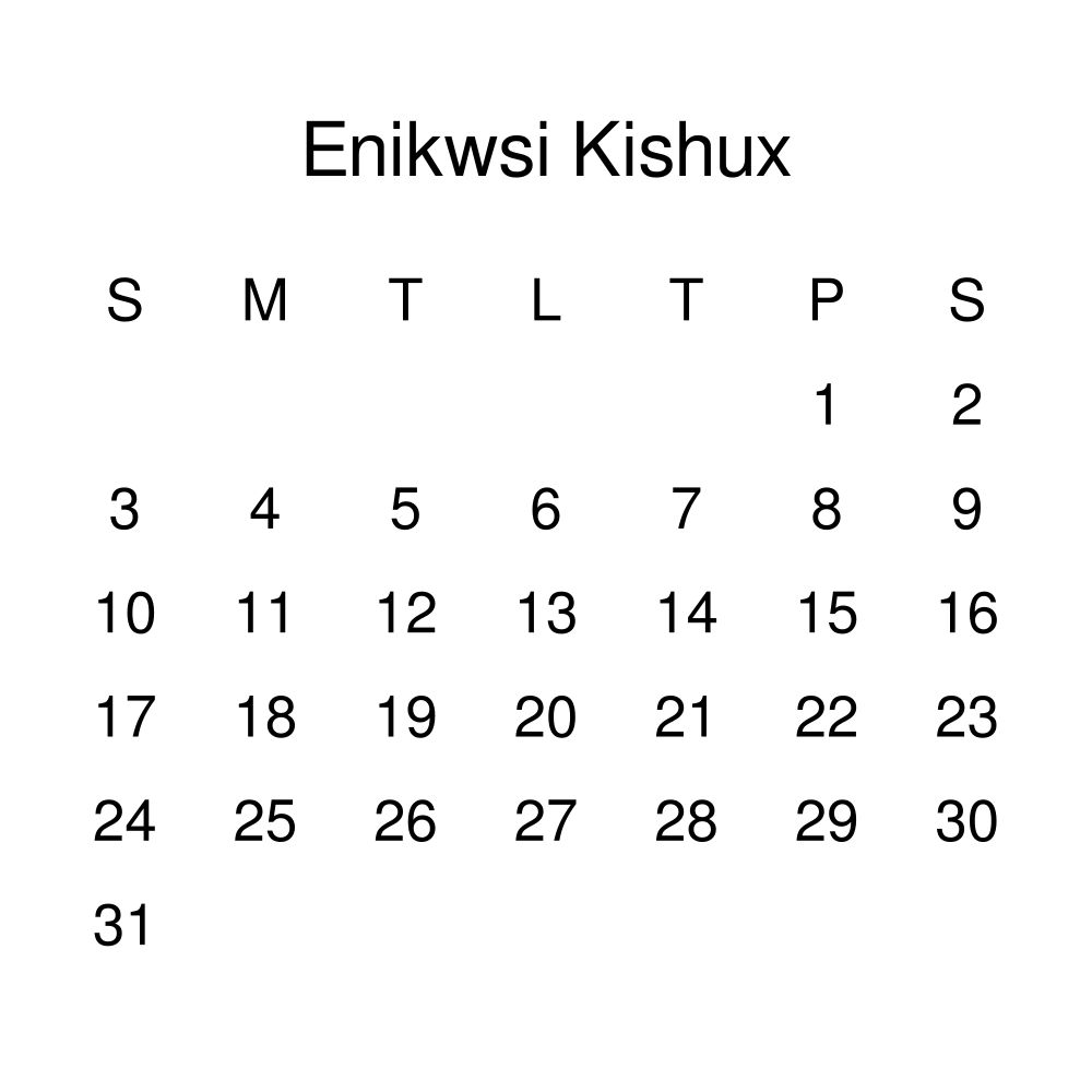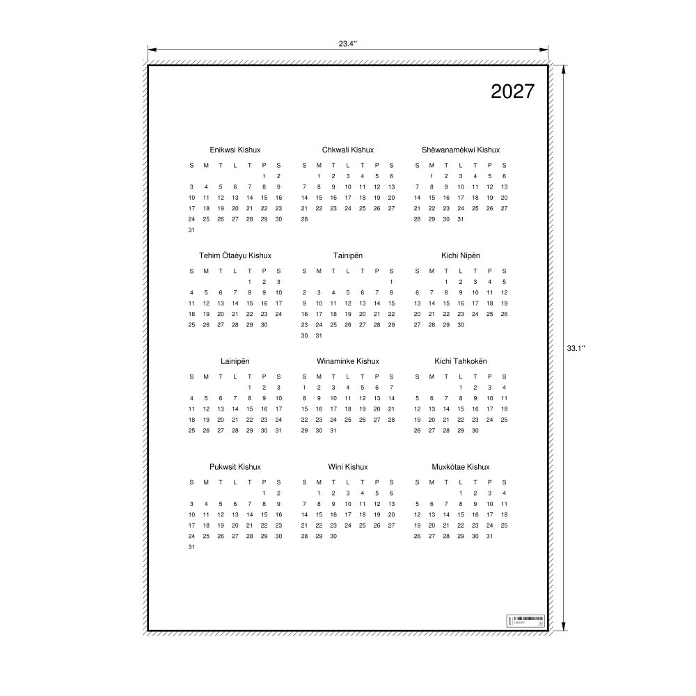 This calendar features the Unami names of months and days of the week on top of a standard Gregorian calendar layout. Beyond its utility for tracking dates, it serves as an educational tool, cultural touchstone (cultural artifact), and functional decor (aesthetic object).