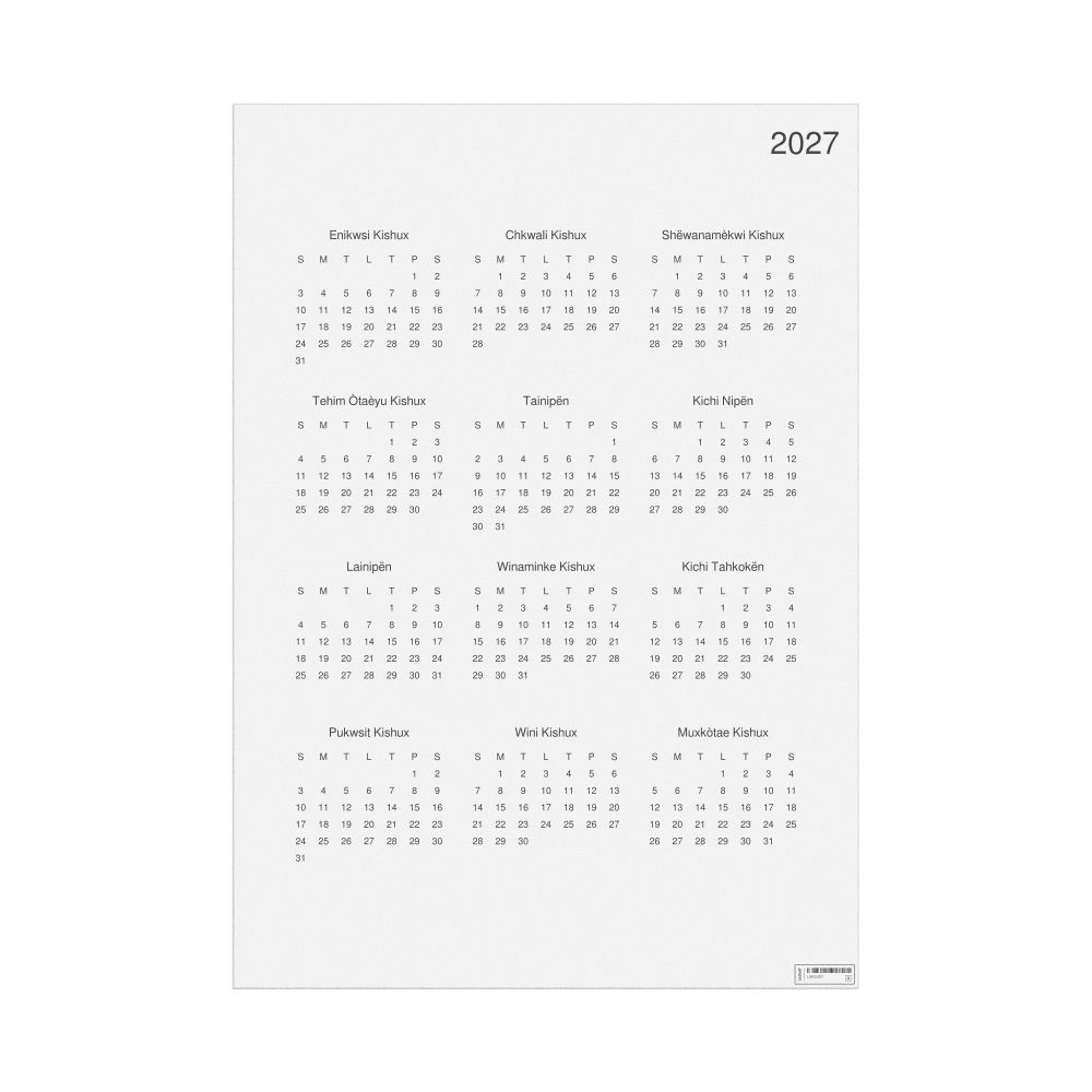 An Unami-language wall calendar (2027, Monday-start format) with English translations.