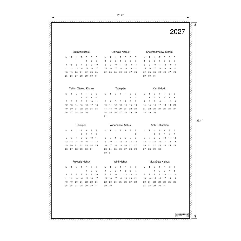 This calendar features the Unami names of months and days of the week on top of a standard Gregorian calendar layout. Beyond its utility for tracking dates, it serves as an educational tool, cultural touchstone (cultural artifact), and functional decor (aesthetic object).