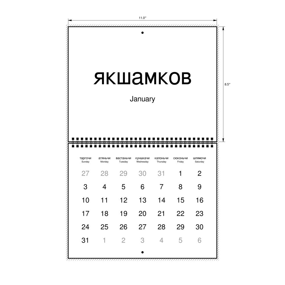 2027 Wall CalendarErzya/English-Labeled, Sunday-Start Layout, Wire-Bound, 11 x 8.5 in (27.9 x 21.6 cm)