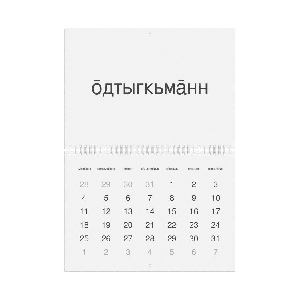 - Linguistics enthusiasts and polyglots - For "language geeks" interested in comparative linguistics or the mechanics of different languages and who value the aesthetic differences in scripts, orthography, and typography of different languages, the Kildin Sámi calendar serves as an object of intellectual interest. You can collect calendars for various languages to compare their linguistic roots (e.g., comparing Romance languages vs. Slavic languages). Leskoff's calendars are characterized by specific typographic choices that highlight the orthography and script unique to the target language. Think correct usage of diacritics, characters, and directional writing (left-to-right vs. right-to-left). The minimalist design focuses on legibility and aesthetic appeal of the script itself.