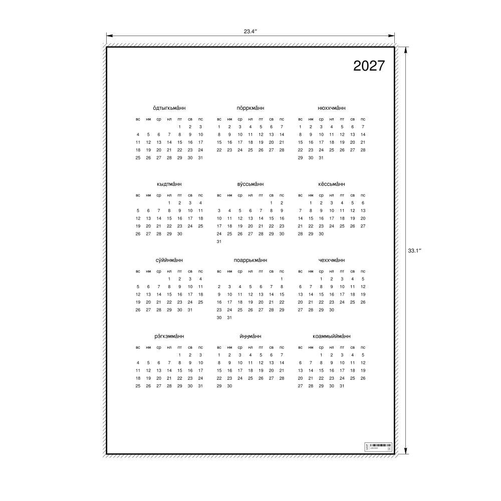 - Linguistics enthusiasts and polyglots - For "language geeks" interested in comparative linguistics or the mechanics of different languages and who value the aesthetic differences in scripts, orthography, and typography of different languages, the Kildin Sámi calendar serves as an object of intellectual interest. You can collect calendars for various languages to compare their linguistic roots (e.g., comparing Romance languages vs. Slavic languages). Leskoff's calendars are characterized by specific typographic choices that highlight the orthography and script unique to the target language. Think correct usage of diacritics, characters, and directional writing (left-to-right vs. right-to-left). The minimalist design focuses on legibility and aesthetic appeal of the script itself.