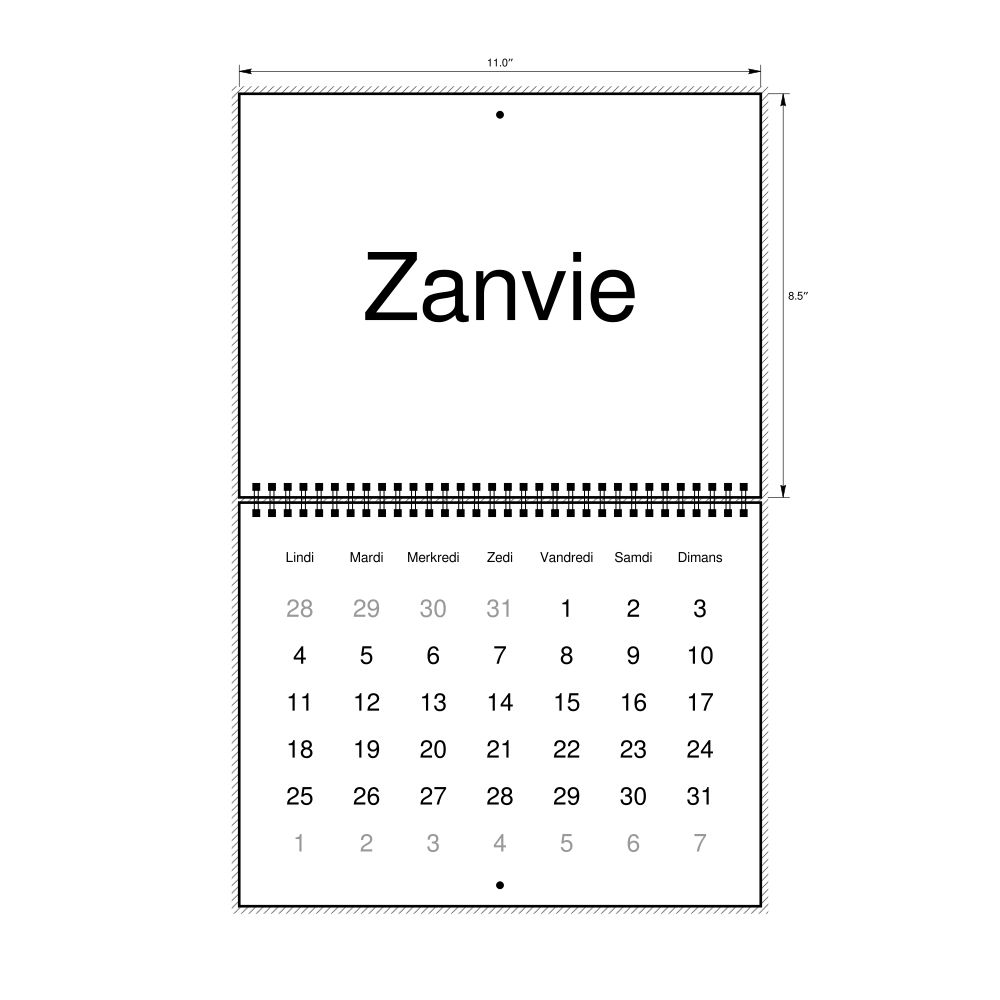 This calendar features the Mauritian Creole names of months and days of the week on top of a standard Gregorian calendar layout. Beyond its utility for tracking dates, it serves as an educational tool, cultural touchstone (cultural artifact), and functional decor (aesthetic object).