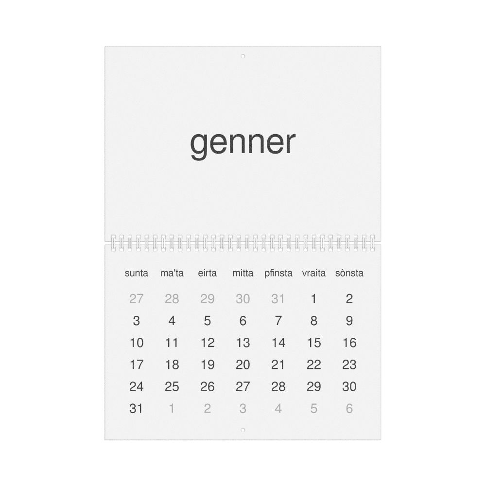 This calendar features the Mòcheno names of months and days of the week on top of a standard Gregorian calendar layout. Beyond its utility for tracking dates, it serves as an educational tool, cultural touchstone (cultural artifact), and functional decor (aesthetic object).