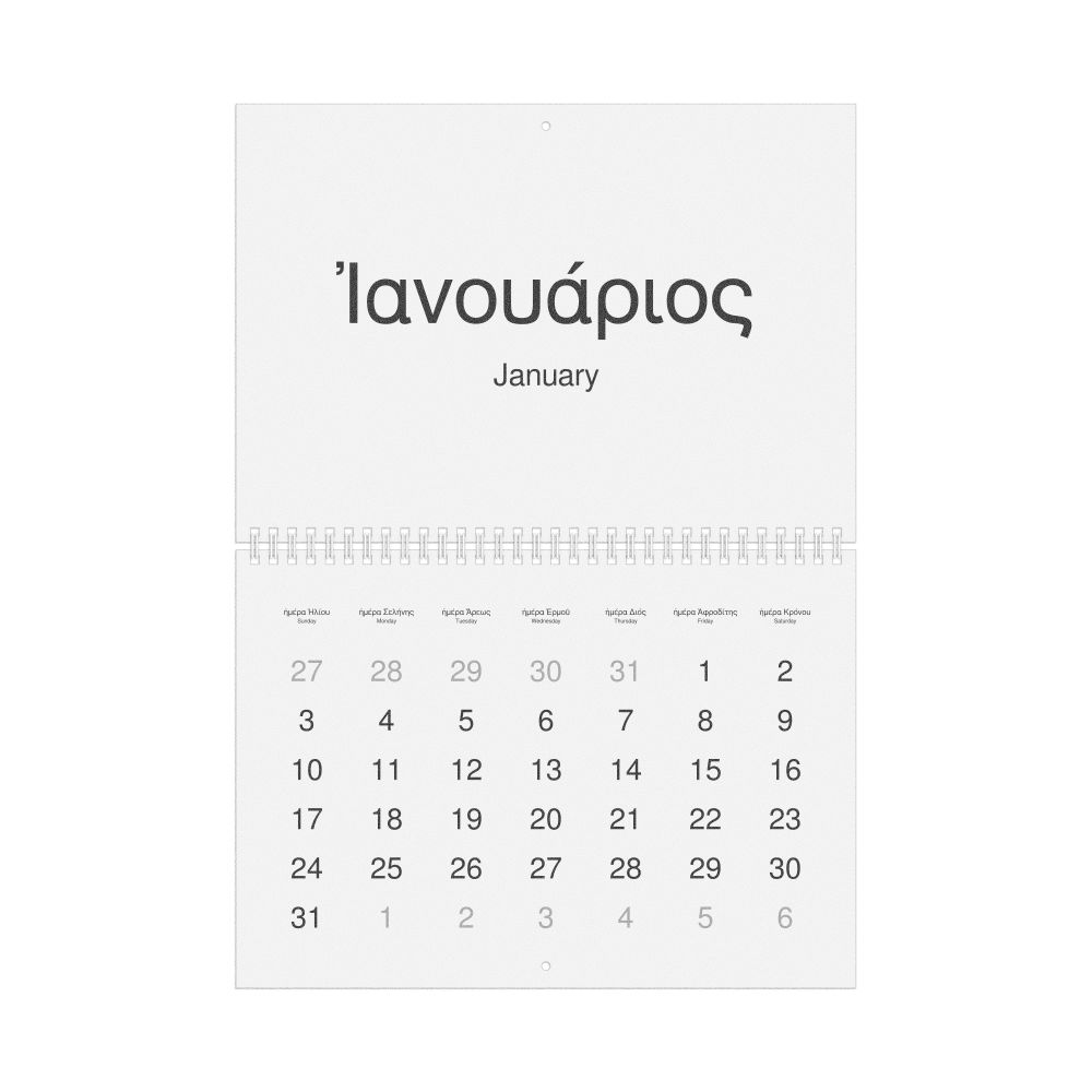- Polyglots and autodidacts - For "language geeks" interested in the origins of different languages, classical literature, and scholarly pursuits and who value the typographic and aesthetic details of historical languages, the Ancient Greek calendar serves as an object of intellectual interest. You can collect calendars for various languages to compare their linguistic roots. The minimalist design focuses on legibility and aesthetic appeal of the historic and reconstructed words themselves.
