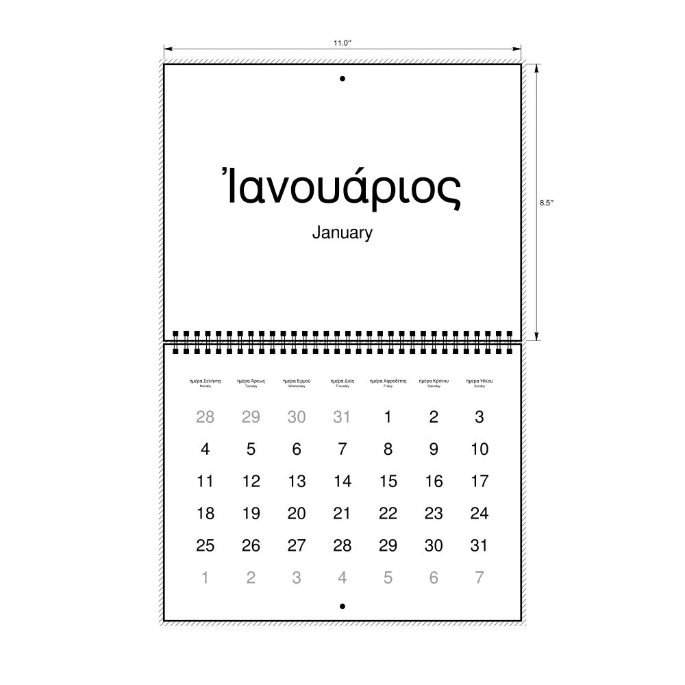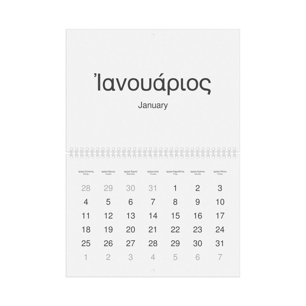 - Polyglots and autodidacts - For "language geeks" interested in the origins of different languages, classical literature, and scholarly pursuits and who value the typographic and aesthetic details of historical languages, the Ancient Greek calendar serves as an object of intellectual interest. You can collect calendars for various languages to compare their linguistic roots. The minimalist design focuses on legibility and aesthetic appeal of the historic and reconstructed words themselves.