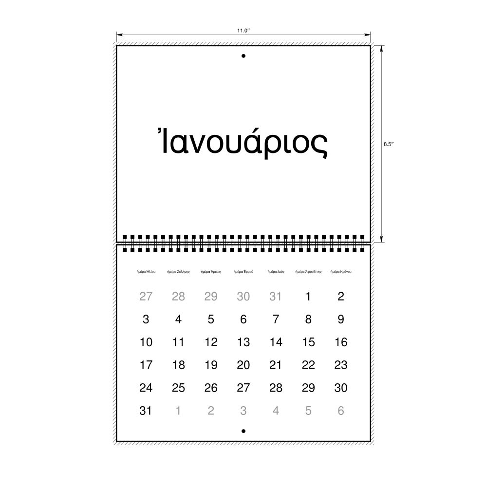 • Polyglots and autodidacts - For "language geeks" interested in the origins of different languages, classical literature, and scholarly pursuits and who value the typographic and aesthetic details of historical languages, the Ancient Greek calendar serves as an object of intellectual interest. You can collect calendars for various languages to compare their linguistic roots. The minimalist design focuses on legibility and aesthetic appeal of the historic and reconstructed words themselves.
