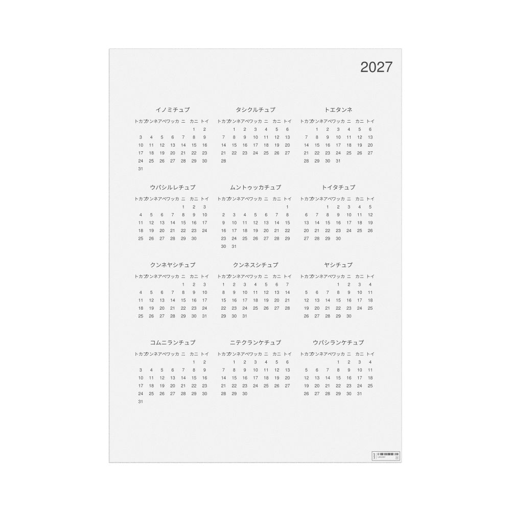 A 2027 wall calendar in Ainu. The calendar uses the Sunday-start week format (common in the US and Canada).