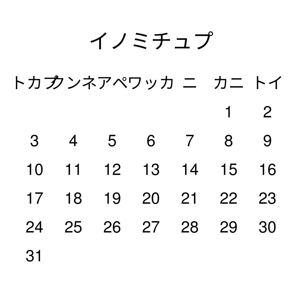 This calendar features the Ainu names of months and days of the week on top of a standard Gregorian calendar layout. Beyond its utility for tracking dates, it serves as an educational tool, cultural touchstone (cultural artifact), and functional decor (aesthetic object).