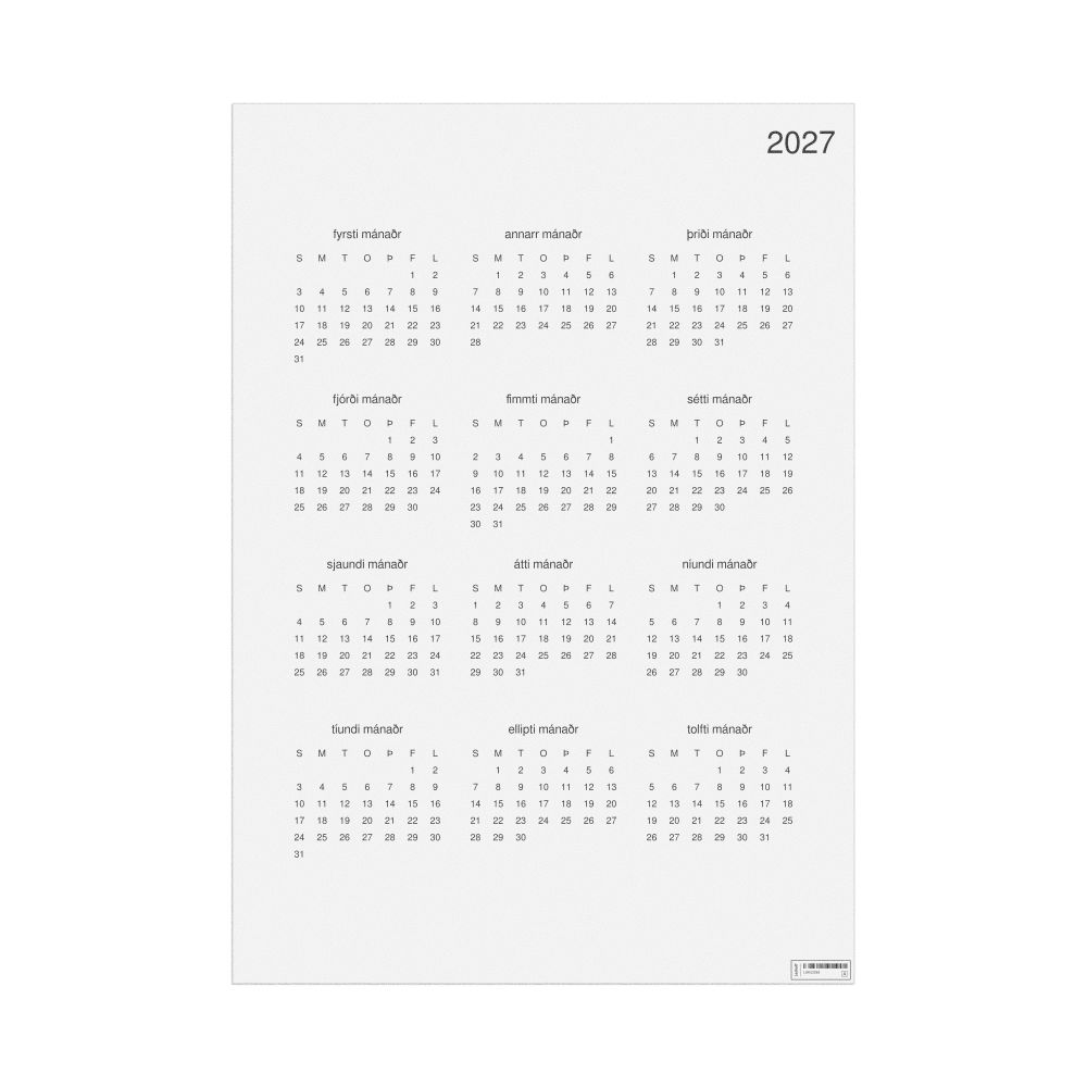 A 2027 wall calendar in Old Norse. The calendar uses the Sunday-start week format (common in the US and Canada).