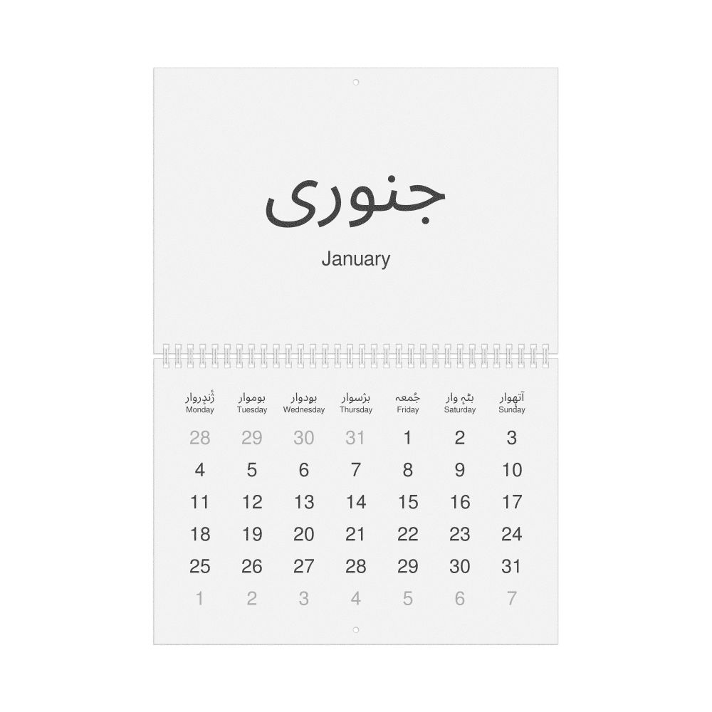 2026 Wall Calendar, Kashmiri/English-Labeled, Monday-Start Layout, Wire-Bound, 11.7 x 8.3 in (29.7 x 21.0 cm)