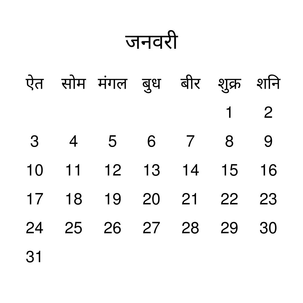 This calendar features the Dogri names of months and days of the week on top of a standard Gregorian calendar layout. Beyond its utility for tracking dates, it serves as an educational tool, cultural touchstone (cultural artifact), and functional decor (aesthetic object).