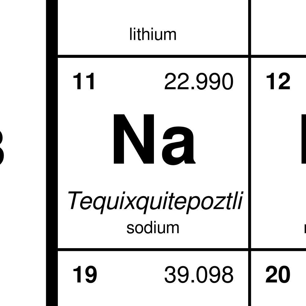 A Nahuatl-language periodic table of the elements with English translations.