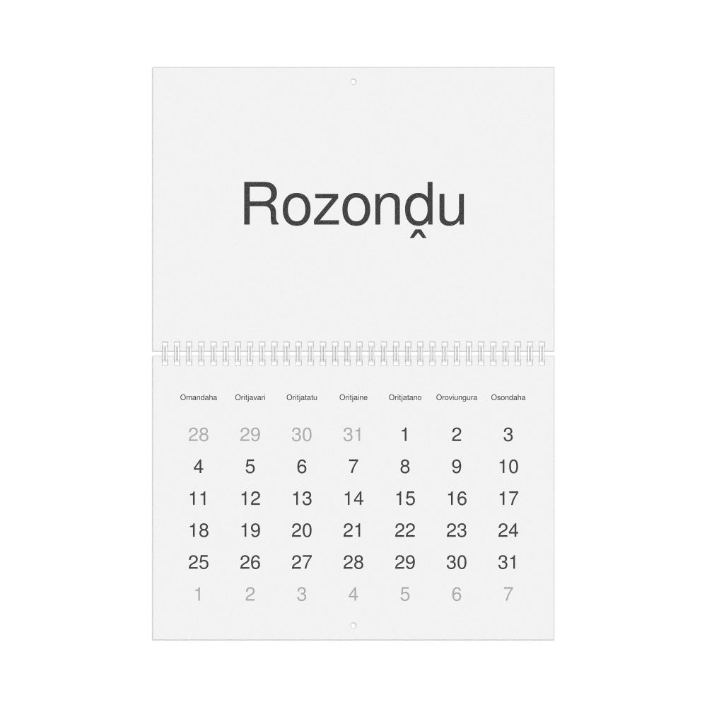 This calendar features the Herero names of months and days of the week on top of a standard Gregorian calendar layout. Beyond its utility for tracking dates, it serves as an educational tool, cultural touchstone (cultural artifact), and functional decor (aesthetic object).