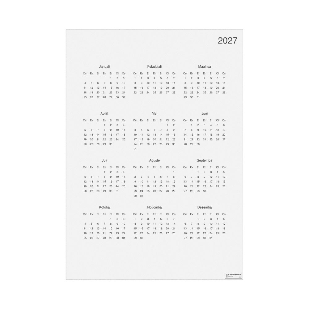 A 2027 wall calendar in Kwanyama. The calendar uses the Monday-start week format (common in the UK and Europe).