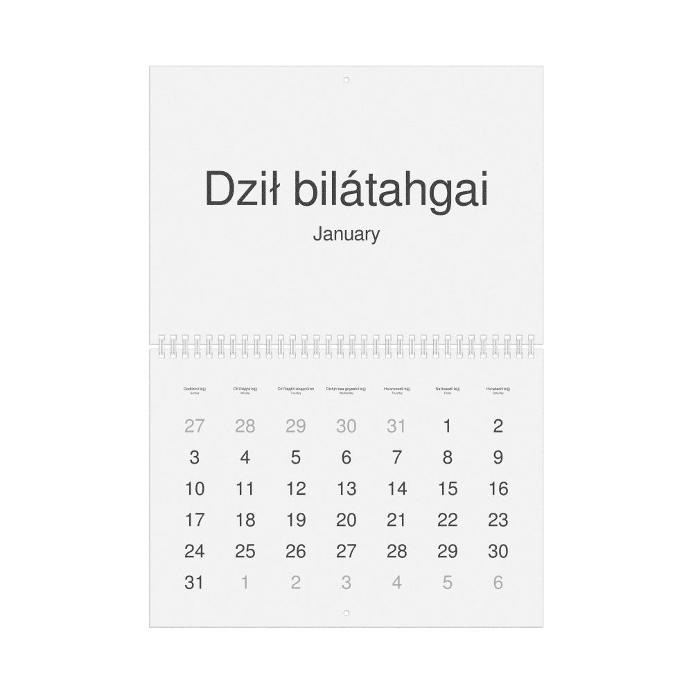 A Western Apache-language wall calendar (2027, Sunday-start format) with English translations.