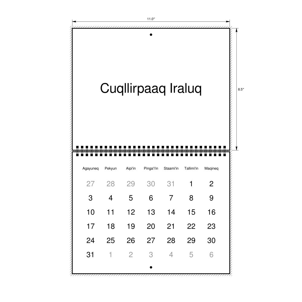 • Alutiiq heritage speakers and cultural connectors - For individuals seeking to maintain a connection to their history, ancestral roots, or the culture associated with the Alutiiq language, the calendar serves as a daily cultural marker. Use it in your home, office, library, or museum as a link to linguistic and cultural identity that integrates Alutiiq into your everyday life. Familiar language script and naming conventions may also provide a sense of home in a foreign environment.