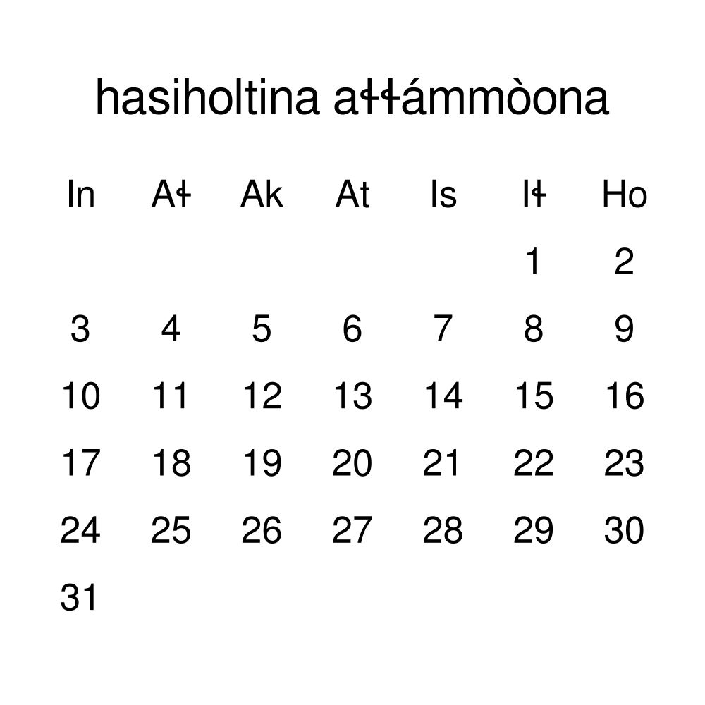 • Alabama speakers and enthusiasts - Choose this calendar if you are looking for a simple, localized calendar in the Alabama language. Use it in your home, office, or classroom as a regular calendar.