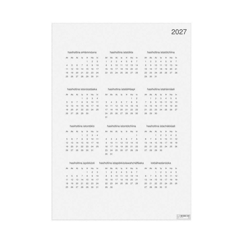 • Alabama heritage speakers and cultural connectors - For individuals seeking to maintain a connection to their history, ancestral roots, or the culture associated with the Alabama language, the calendar serves as a daily cultural marker. Use it in your home, office, library, or museum as a link to linguistic and cultural identity that integrates Alabama into your everyday life. Familiar language script and naming conventions may also provide a sense of home in a foreign environment.