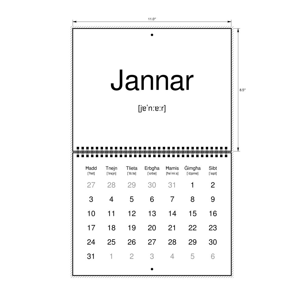 2027 Phonetic Wall CalendarMaltese-Labeled with IPA, Sunday-Start Layout, Wire-Bound, 11 x 8.5 in (27.9 x 21.6 cm)