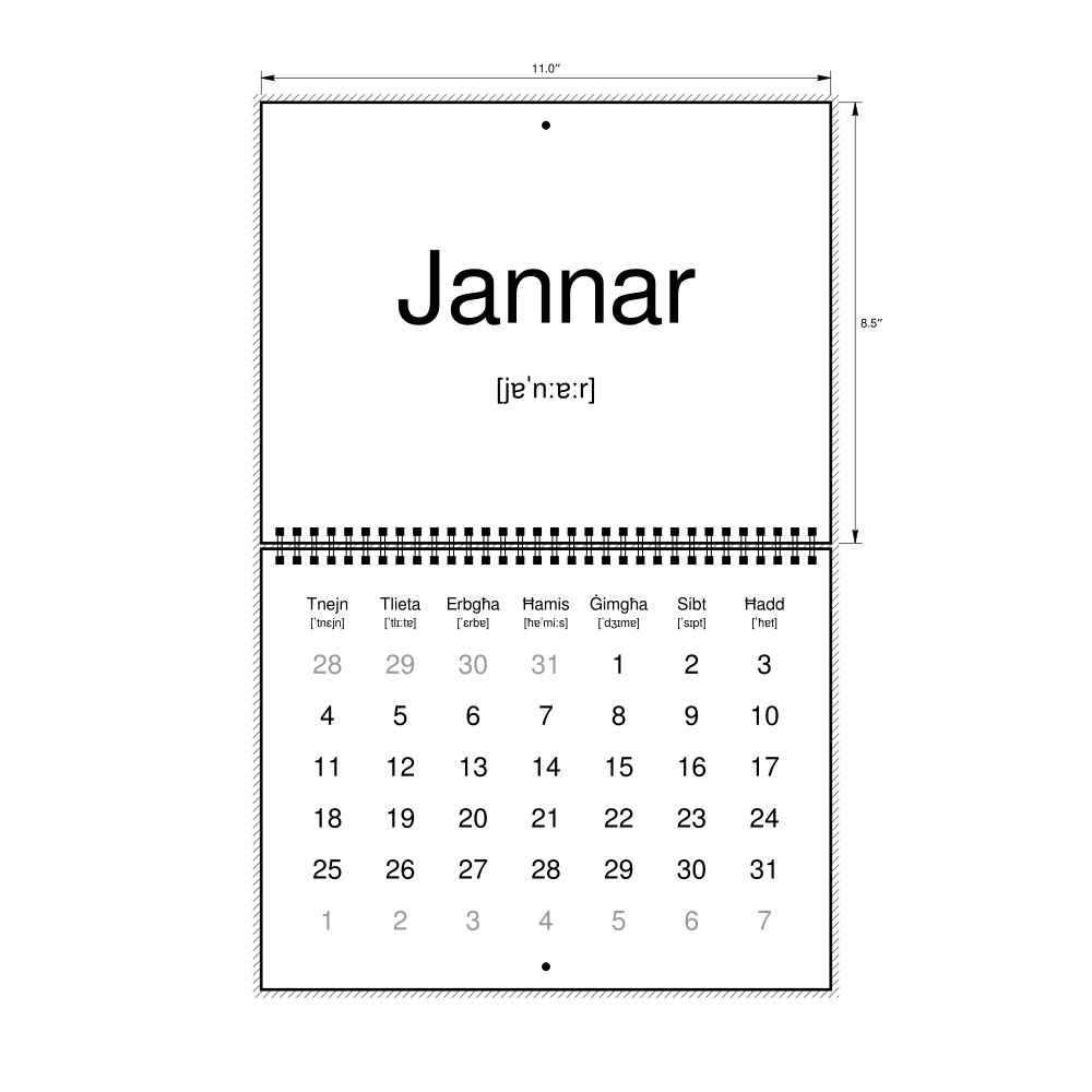 2027 Phonetic Wall CalendarMaltese-Labeled with IPA, Monday-Start Layout, Wire-Bound, 11 x 8.5 in (27.9 x 21.6 cm)