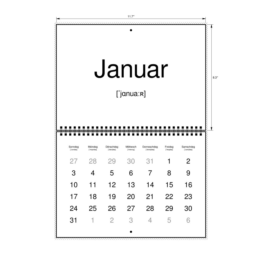 2027 Phonetic Wall CalendarLuxembourgish-Labeled with IPA, Sunday-Start Layout, Wire-Bound, 11.7 x 8.3 in (29.7 x 21.0 cm)