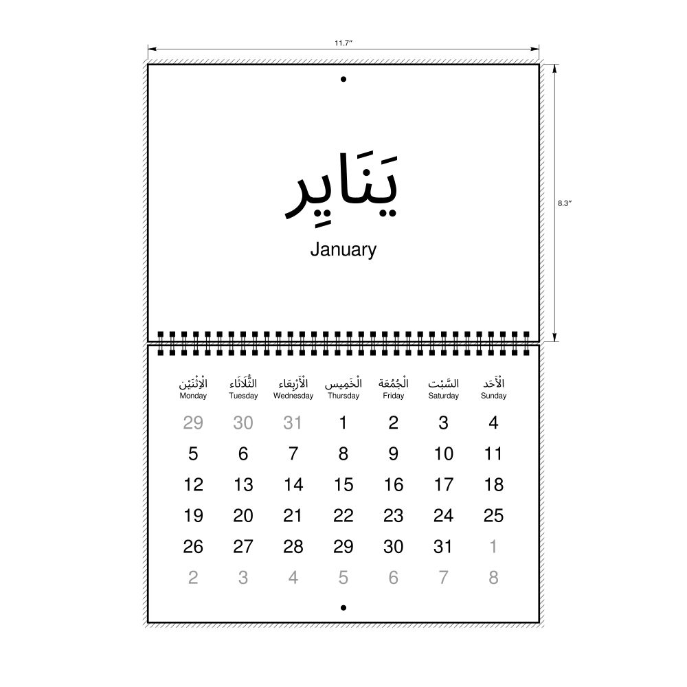 2026 Wall CalendarArabic (tashkeel)/English-Labeled, Monday-Start Layout, Wire-Bound, 11.7 x 8.3 in (29.7 x 21.0 cm)