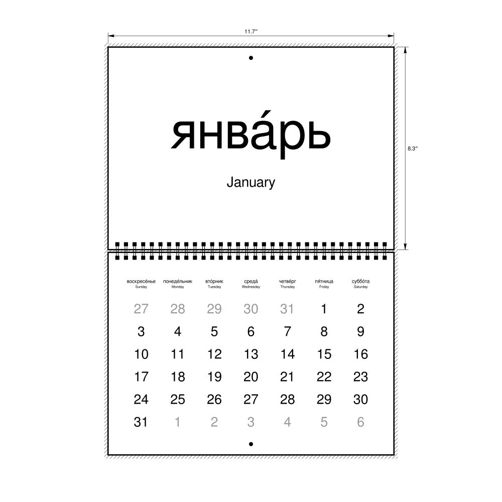 2027 Wall CalendarRussian (accented)/English-Labeled, Sunday-Start Layout, Wire-Bound, 11.7 x 8.3 in (29.7 x 21.0 cm)