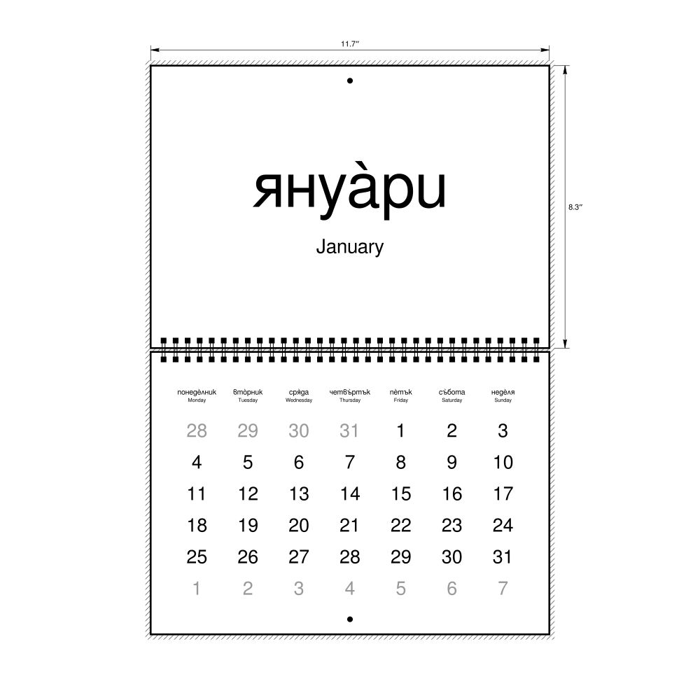 2027 Wall Calendar, Bulgarian (accented)/English-Labeled, Sunday-Start Layout, Wire-Bound, 11.7 x 8.3 in (29.7 x 21.0 cm)