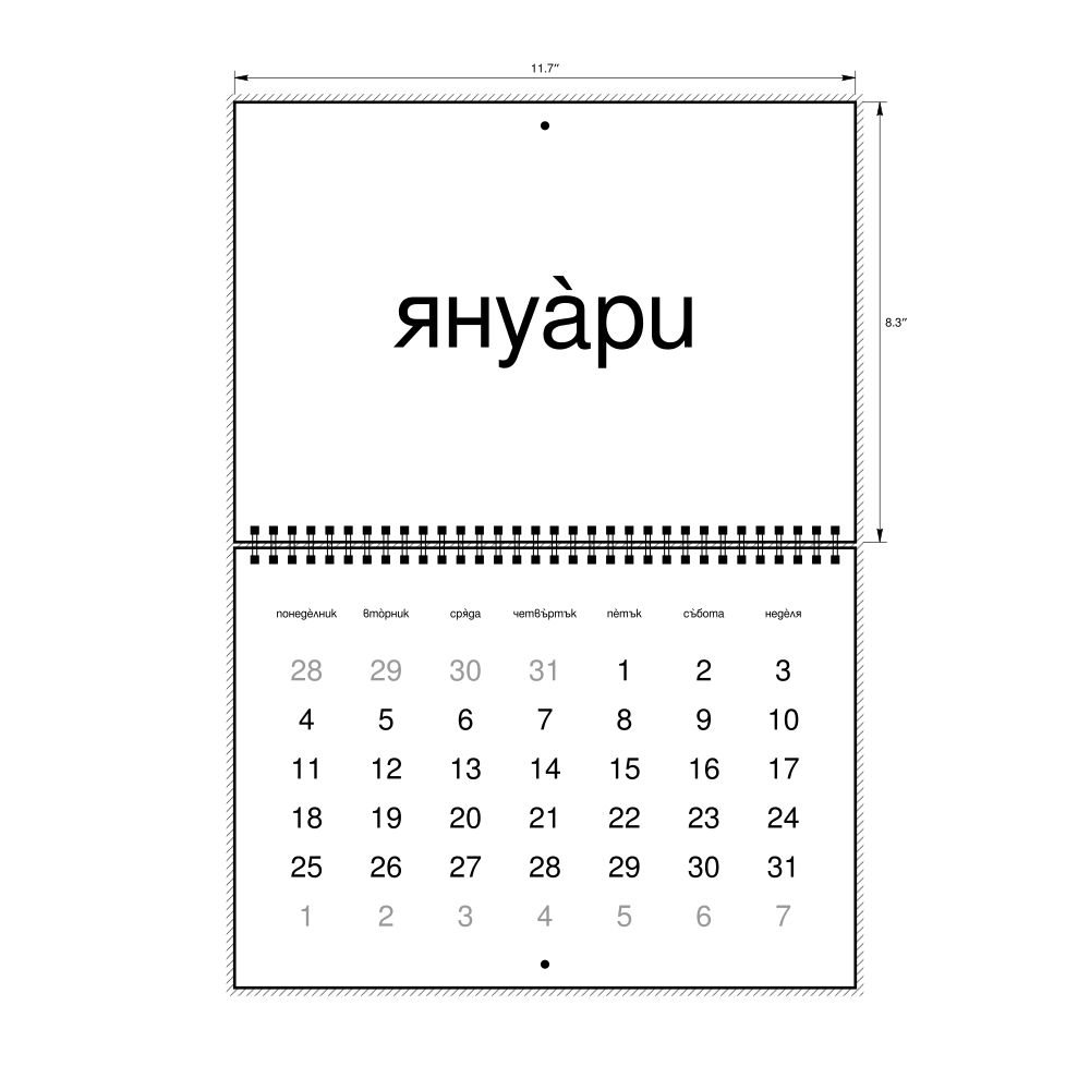 - Linguistics enthusiasts and polyglots - For "language geeks" interested in comparative linguistics or the mechanics of different languages and who value the aesthetic differences in scripts, orthography, and typography of different languages, the Bulgarian calendar serves as an object of intellectual interest. You can collect calendars for various languages to compare their linguistic roots (e.g., comparing Romance languages vs. Slavic languages). Leskoff's calendars are characterized by specific typographic choices that highlight the orthography and script unique to the target language. Think correct usage of diacritics, characters, and directional writing (left-to-right vs. right-to-left). The minimalist design focuses on legibility and aesthetic appeal of the script itself.