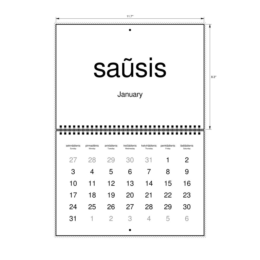 2027 Wall CalendarLithuanian (accented)/English-Labeled, Sunday-Start Layout, Wire-Bound, 11.7 x 8.3 in (29.7 x 21.0 cm)