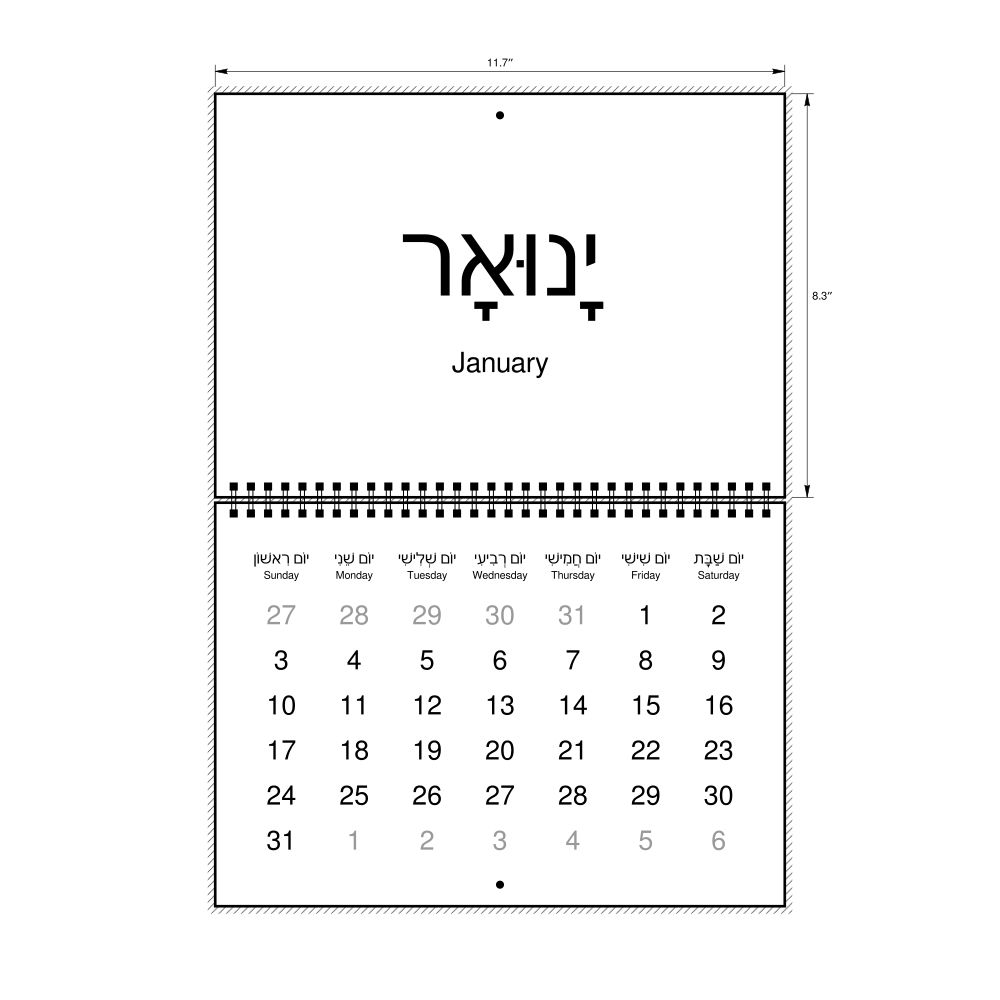 2026 Wall Calendar, Hebrew (niqqud)/English-Labeled, Sunday-Start Layout, Wire-Bound, 11.7 x 8.3 in (29.7 x 21.0 cm)