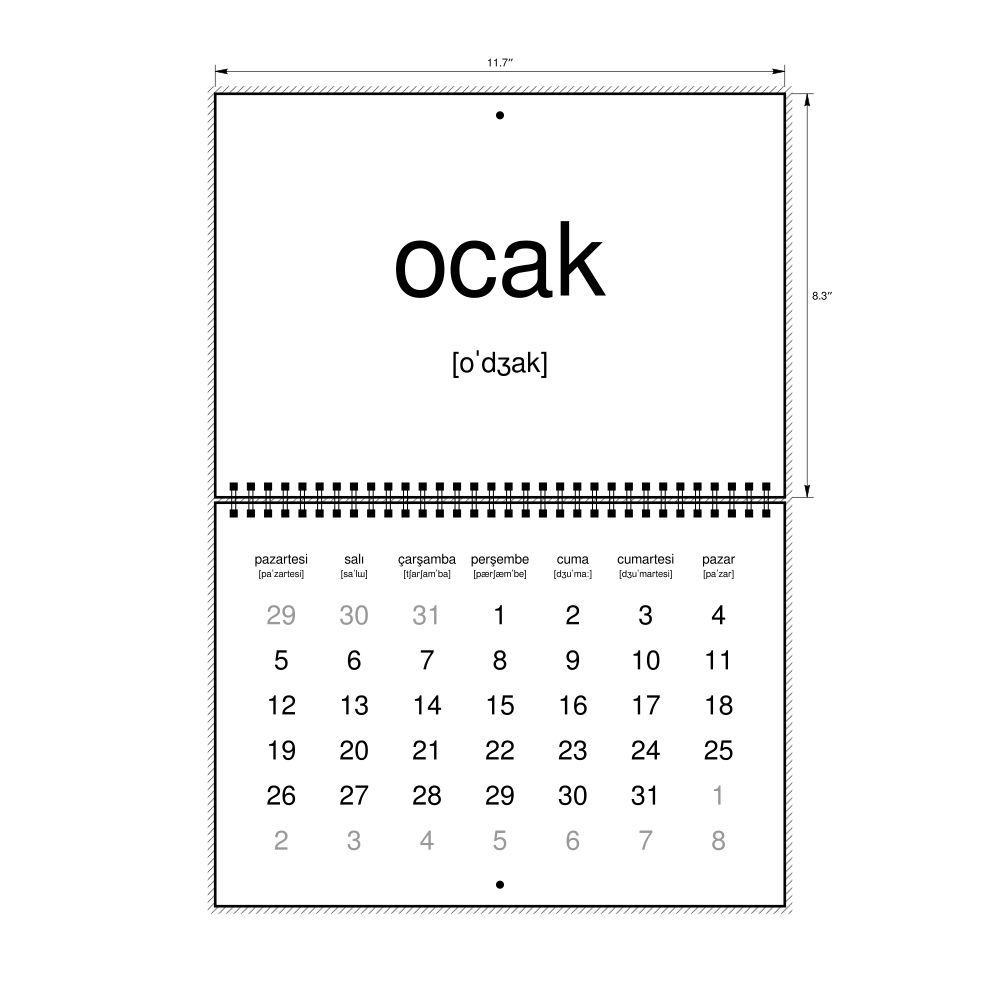 2026 Phonetic Wall CalendarTurkish-Labeled with IPA, Monday-Start Layout, Wire-Bound, 11.7 x 8.3 in (29.7 x 21.0 cm)