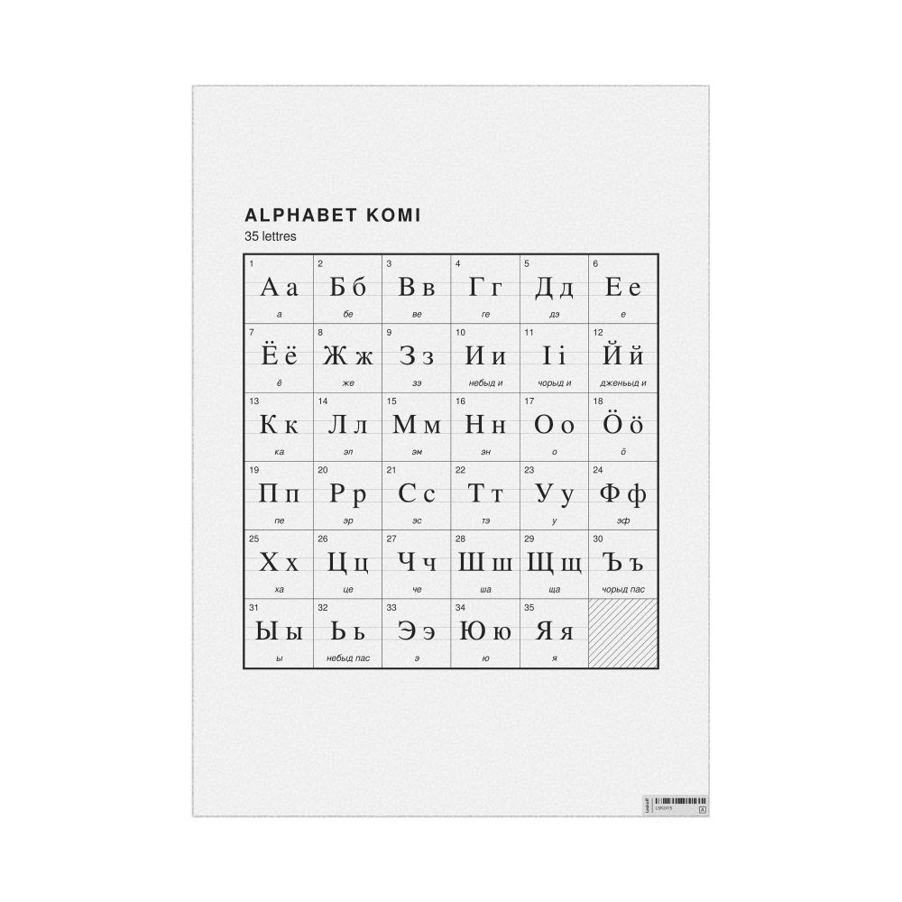 - Linguists and philologists - For both professionals and hobbyists, this alphabet print serves as a piece of linguistic art that presents the character inventory of Komi as a linguistic (graphemic) dataset. Add this to your Komi collection to complement your studies and research. A mixture of Komi letters and French metatext makes it a unique, visually intriguing illustration of linguistic diversity and interaction.