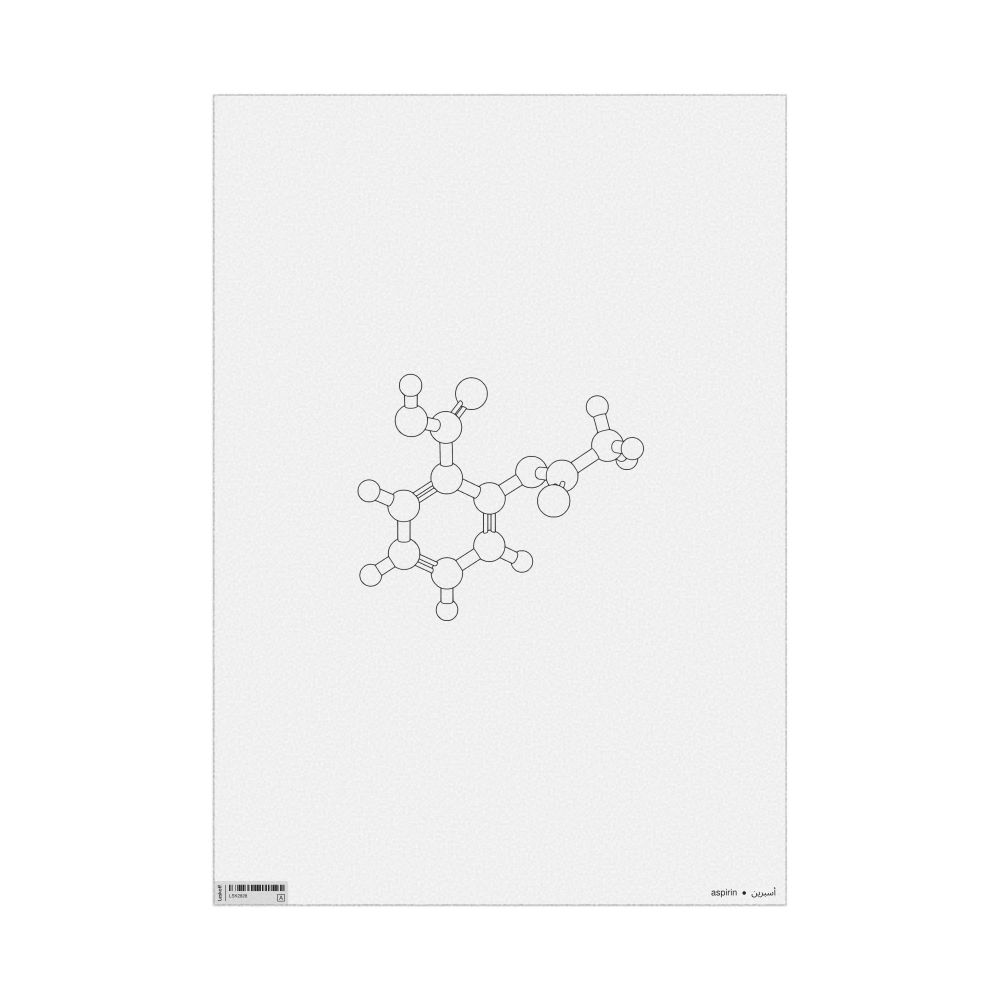 A poster featuring the ball-and-stick model (stylized) of the aspirin molecule.