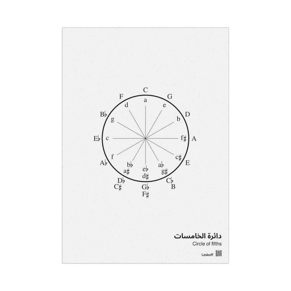 A poster featuring the circle of fifths (a music theory concept that shows the relationship between the 12 major and minor keys) in Arabic (دائرة الخامسات) with English translations.