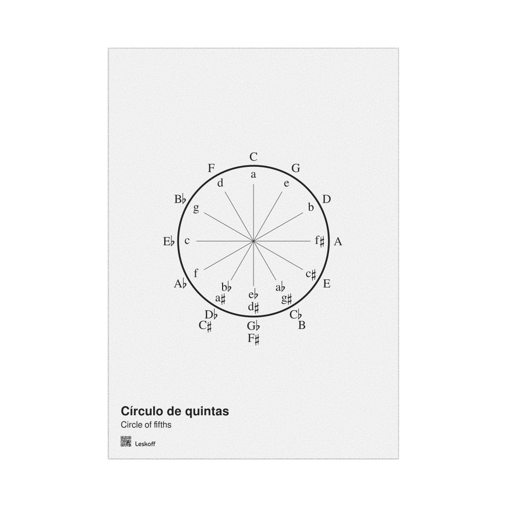 A poster featuring the circle of fifths (a music theory concept that shows the relationship between the 12 major and minor keys) in Portuguese (Círculo de quintas) with English translations.