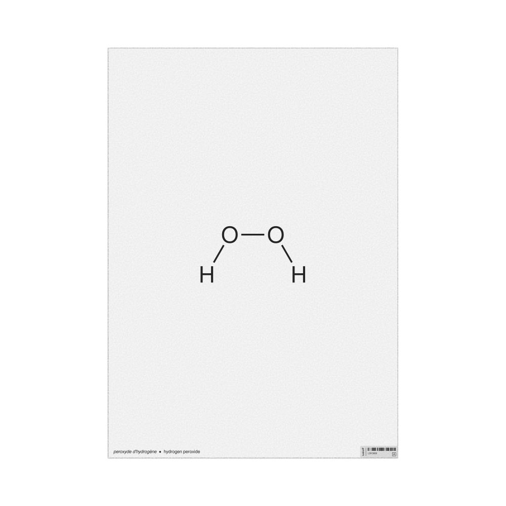 A poster featuring the 2D structure of the hydrogen peroxide molecule in French (peroxyde d'hydrogène) with English translations.