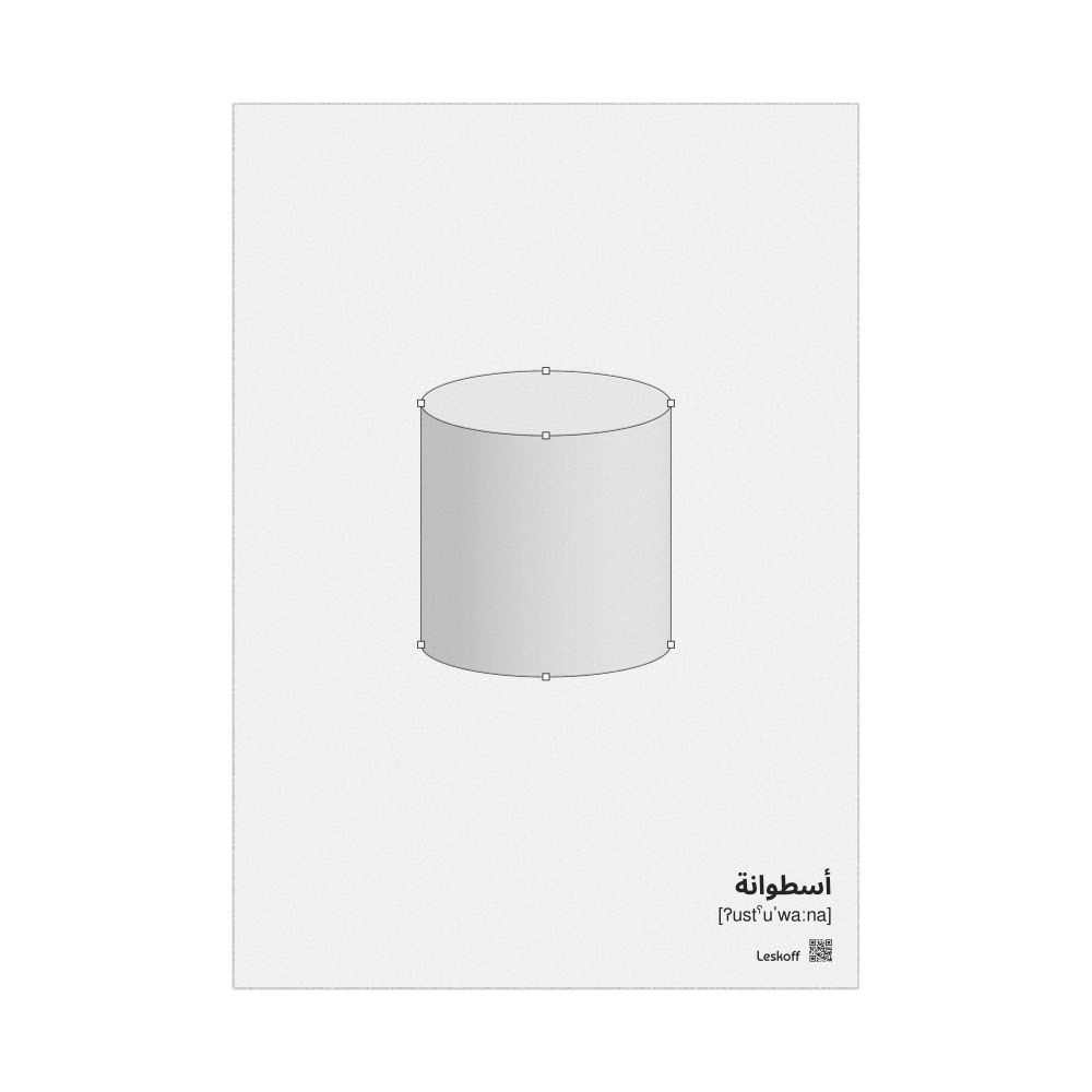 A poster featuring a cylinder in Arabic (أسطوانة) with IPA phonetic transcriptions (pronunciation guides).