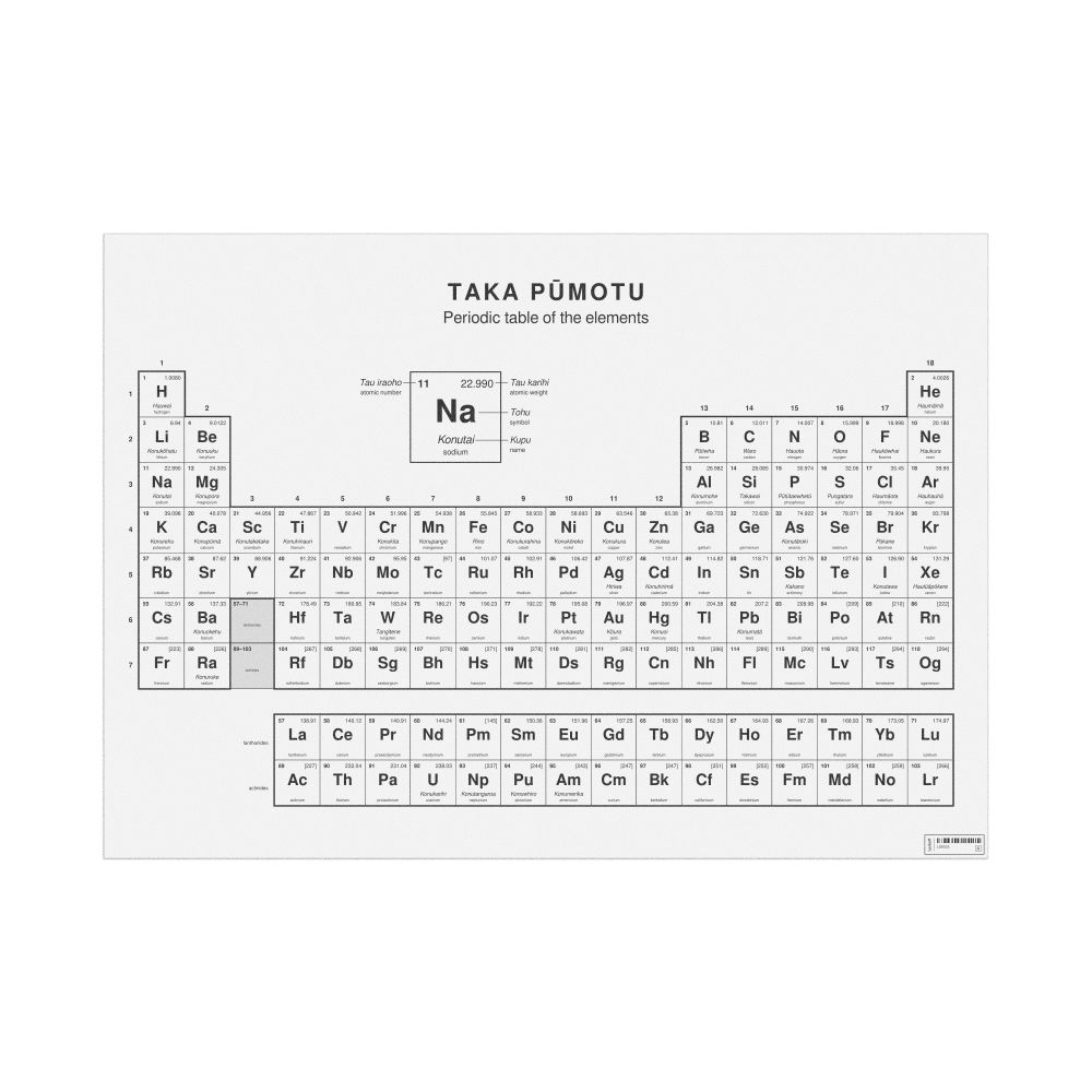 A periodic table chart in Māori (Taka pūmotu) with English translations in the 33.1 x 23.4 in (84.1 x 59.4 cm, poster / wall chart) format. 18-column layout featuring the atomic numbers, atomic weights, symbols, and names of all chemical elements.