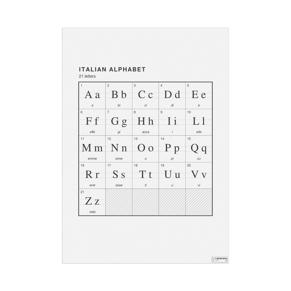 The Italian alphabet chart (the full set of letters) in the 23.4 x 33.1 in (59.4 x 84.1 cm, poster / wall chart) format.