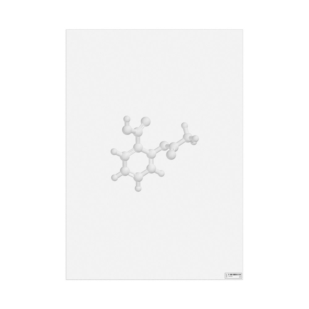 A poster featuring the ball-and-stick model of the aspirin molecule.