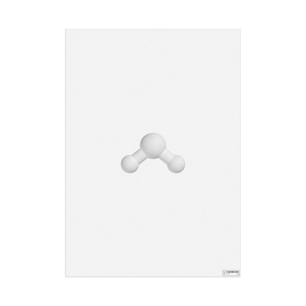 A poster featuring the ball-and-stick model of the water molecule.