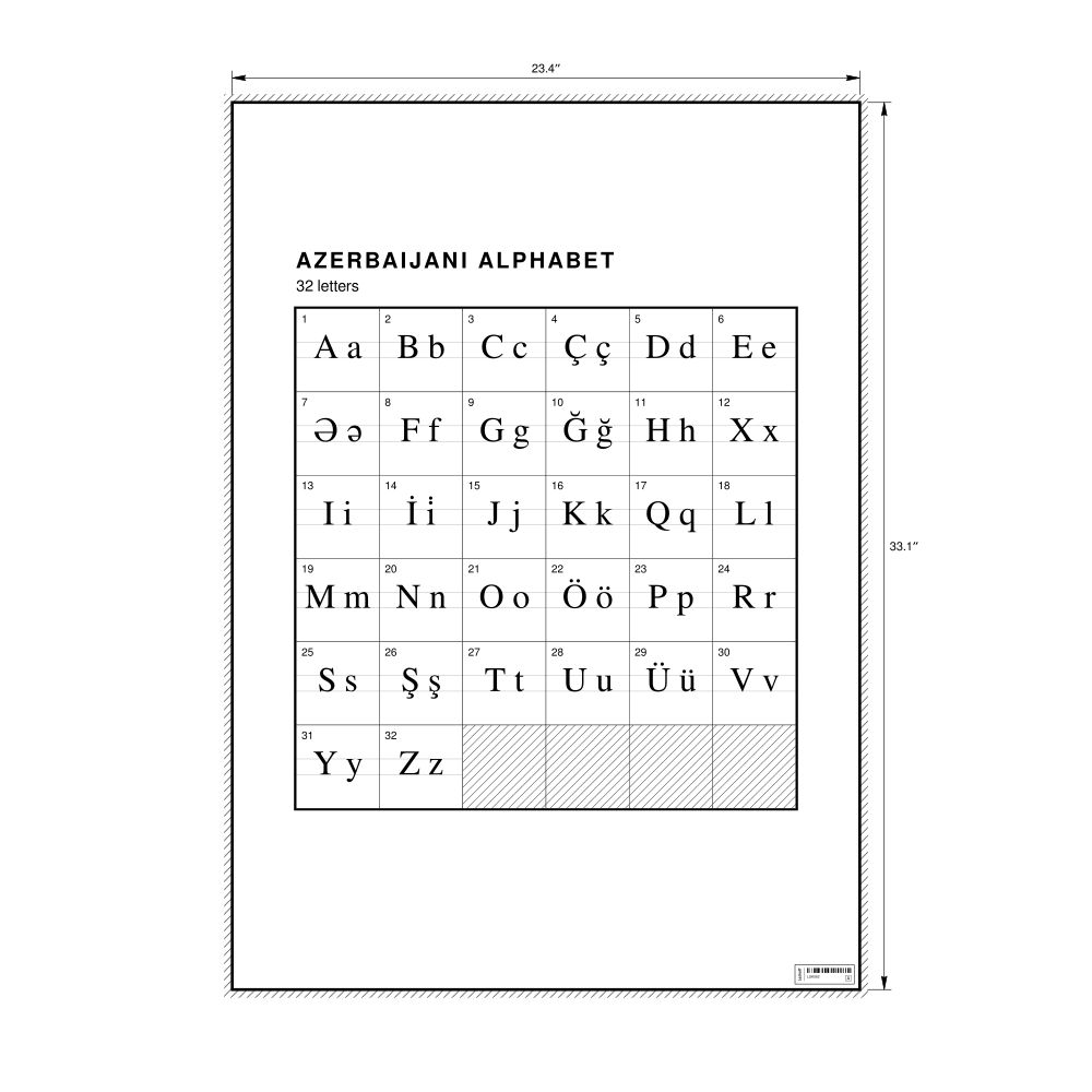 The Azerbaijani alphabet chart (the full set of letters) in the 23.4 x 33.1 in (59.4 x 84.1 cm, poster / wall chart) format.