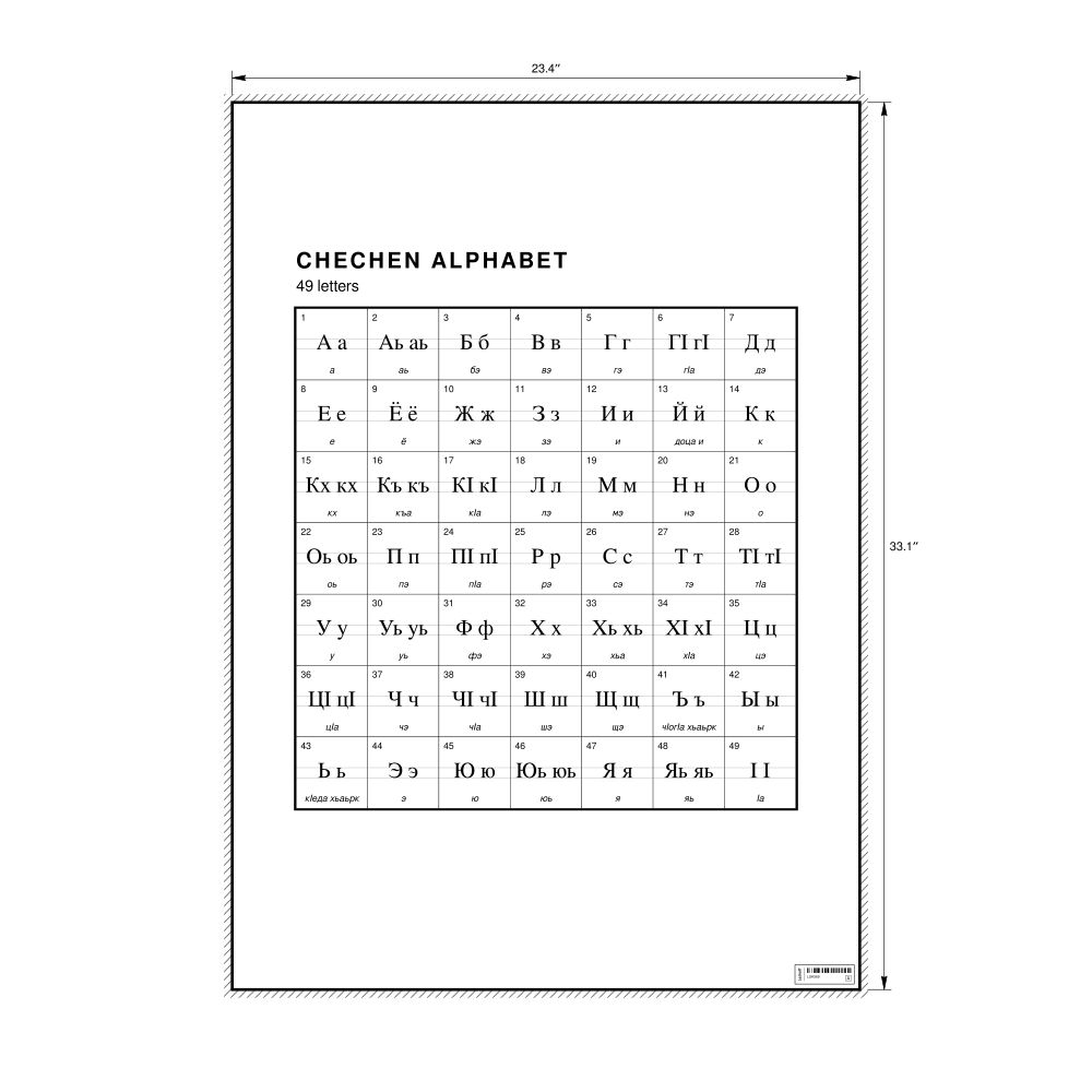 The Chechen alphabet chart (the full set of letters) in the 23.4 x 33.1 in (59.4 x 84.1 cm, poster / wall chart) format.