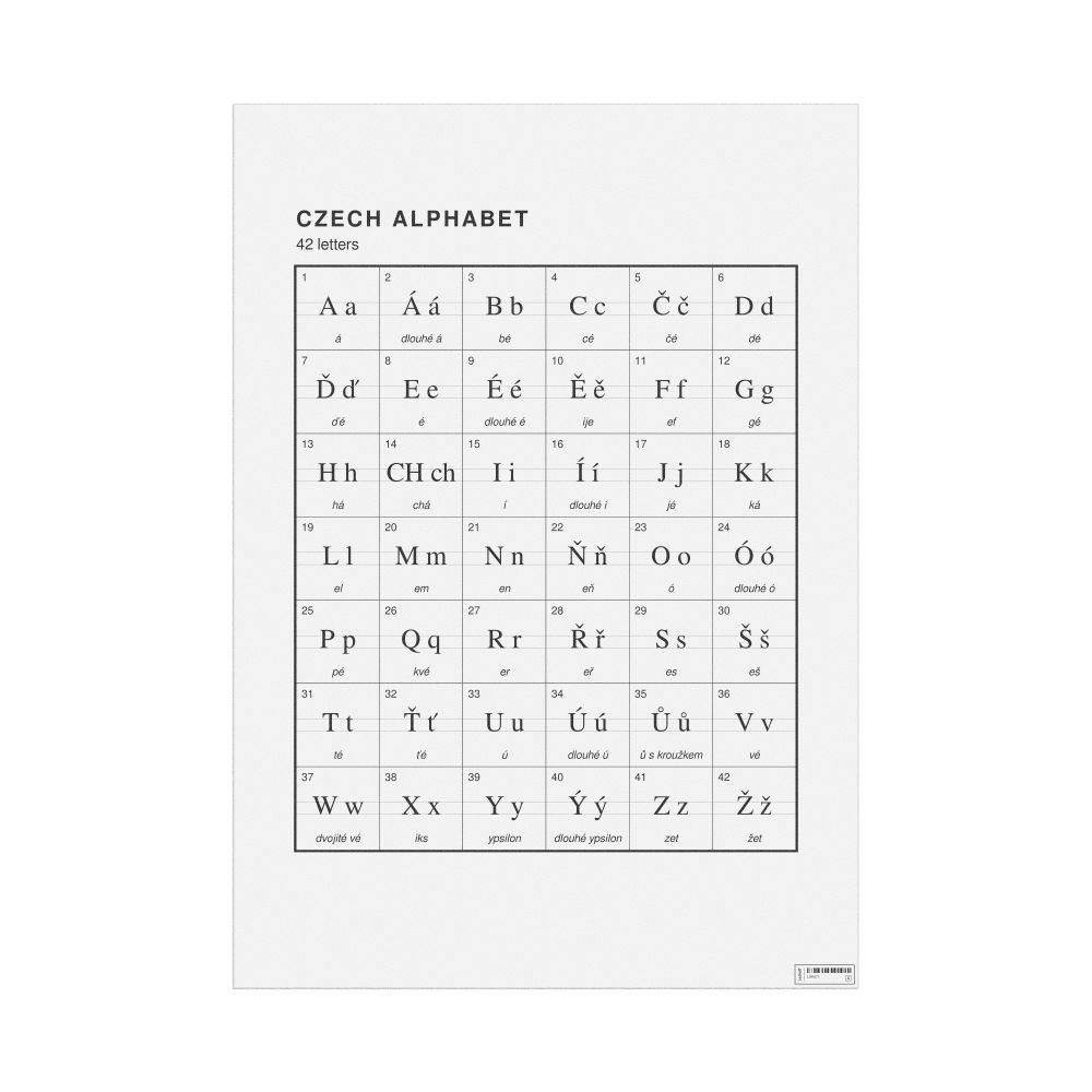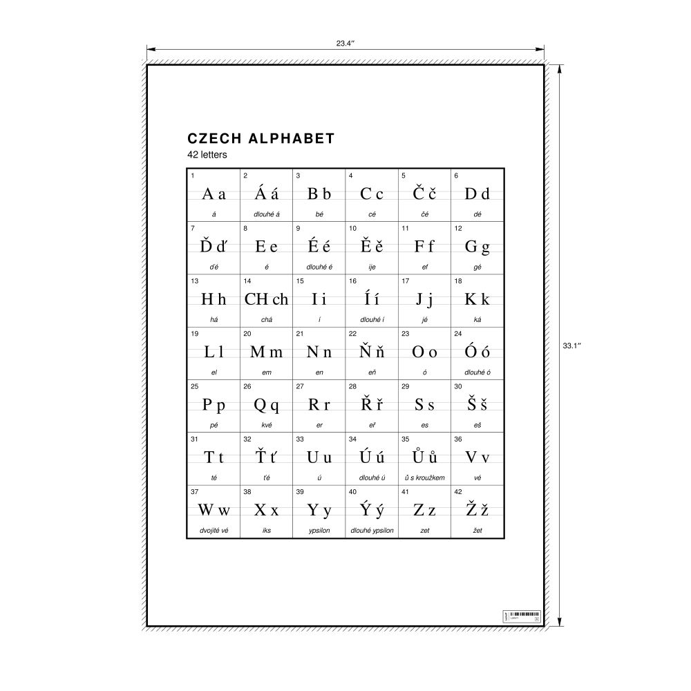 The Czech alphabet chart (the full set of letters) in the 23.4 x 33.1 in (59.4 x 84.1 cm, poster / wall chart) format.