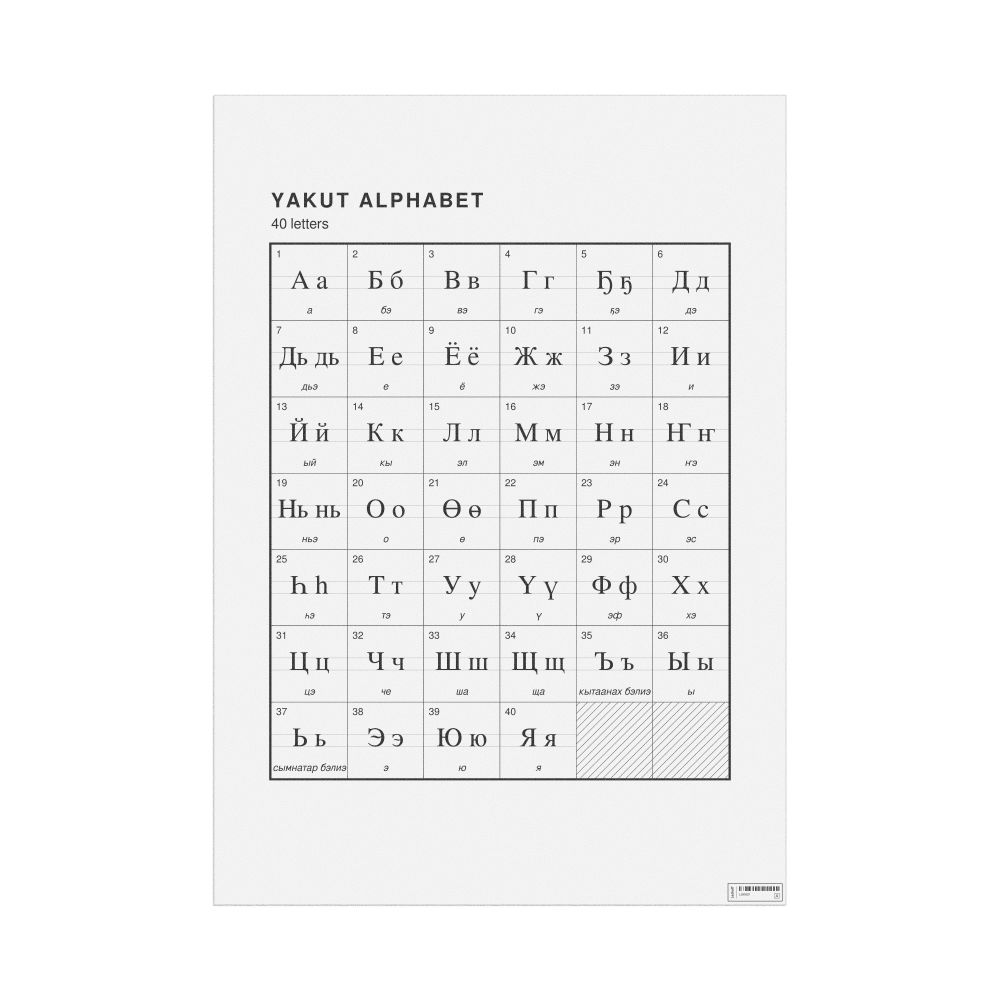 The Yakut alphabet chart (the full set of letters) in the 23.4 x 33.1 in (59.4 x 84.1 cm, poster / wall chart) format.
