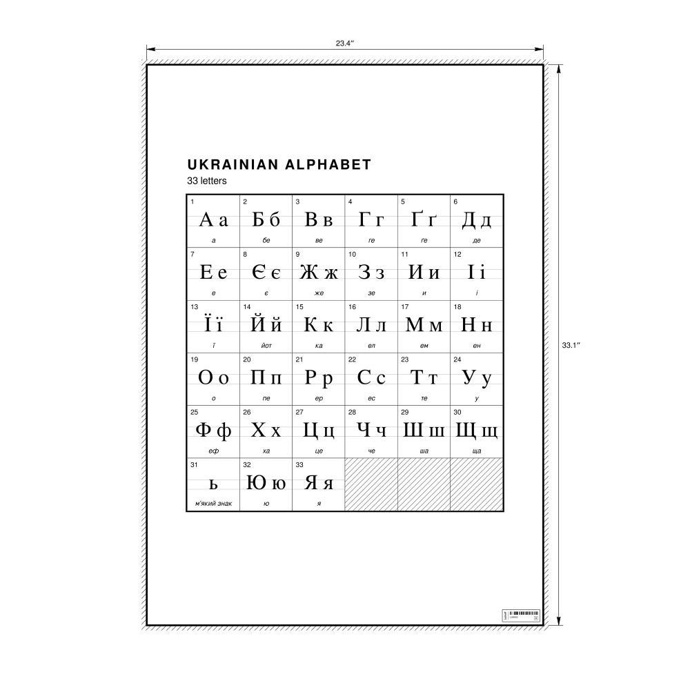 The Ukrainian alphabet chart (the full set of letters) in the 23.4 x 33.1 in (59.4 x 84.1 cm, poster / wall chart) format.