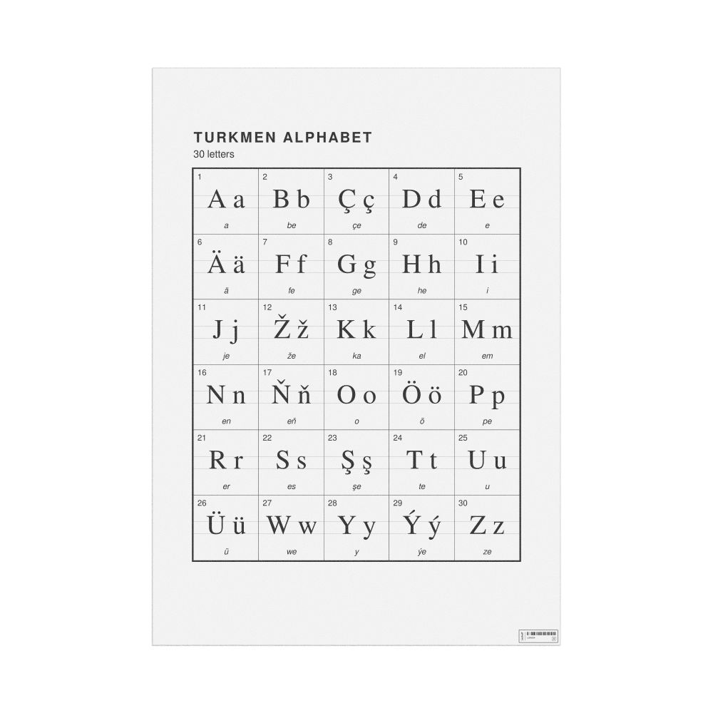 The Turkmen alphabet chart (the full set of letters) in the 23.4 x 33.1 in (59.4 x 84.1 cm, poster / wall chart) format.