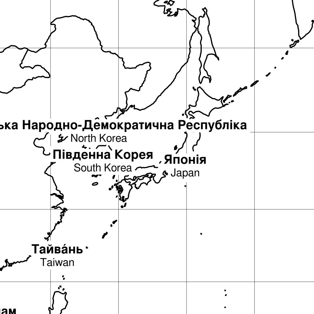 A Ukrainian-language map of the world (countries and regions) with English translations.